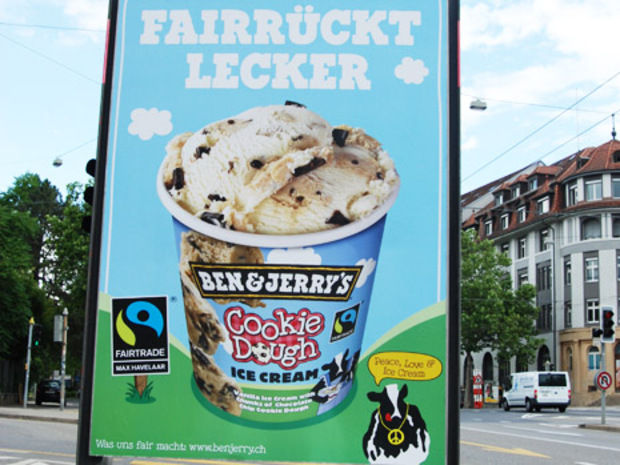 Der «Schweizer Bauer» hat nachgefragt. Die Milch in den Ben&Jerry-Glacen ist nicht fairtrade-zertifiziert, wie Regula Weber von Max Havelaar mitteilt. Und obwohl die Glacen meist zu mehr als 50 Prozent aus Milchprodukten bestehen und sowohl auf der Verpackung als auch auf dem Plakat eine unverkennbare Milchkuh prangt, darf sich das Produkt mit dem Fairtrade-Logo von Max Havelaar schmücken. Zertifiziert sind nämlich die Inhaltsstoffe, die aus sogenannten Entwicklungsländern kommen. Also allenfalls Zucker, Kakao, Vanille, Kaffee, Nüsse und dergleichen. «Wir von Max Havelaar erlauben die Auslobung von zusammengesetzten Produkten, wenn diejenigen Zutaten, die zertifiziert werden können, zertifiziert sind.»