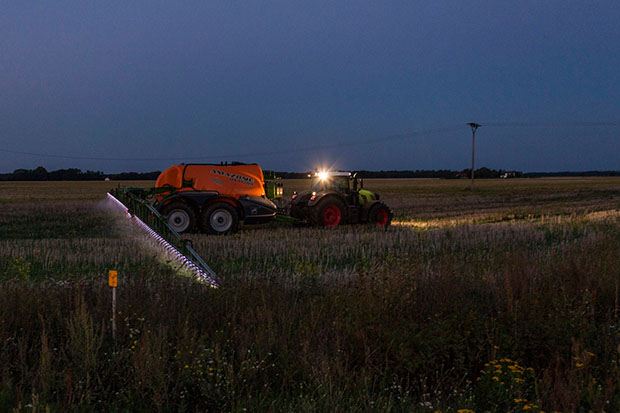 Mit 12'000 l Tankvolumen und einem Tandemachsaggregat ist die UX 11200 die derzeit grösste Anhängespritze im Amazone-Programm. Ausgerüstet mit einem 40 m breiten Super-L-Gestänge und gezogen von einem 330 PS starken Fendt-Traktor konnte sie im Zuge der 24-Stunden-Rekord je nach Witterungs- und Feldbedingungen tagsüber mit 13 bis 15 km/h und nachts – dank Windstille sowie Taubildung auf den Pflanzen - mit 17 km/h gefahren werden.