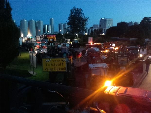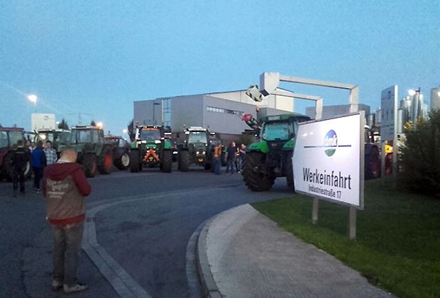 „Die Milchpreise des Molkereikonzerns DMK sind in Deutschland und auch im europäischen Vergleich Schlusslicht. DMK zahlt nur 20 Cent (22 Rp.) je Liter Milch, das sind fünf Cent weniger als der EU-Durchschnitt. Das DMK bedroht damit die wirtschaftliche Zukunft von Tausenden Milchviehbetrieben. Wir müssen uns wehren“, erläutert Ottmar Ilchmann, stellvertretender Vorsitzender der Arbeitsgemeinschaft bäuerliche Landwirtschaft (AbL) und Milchbauer aus Ostfriesland, den Grund für den Protest.