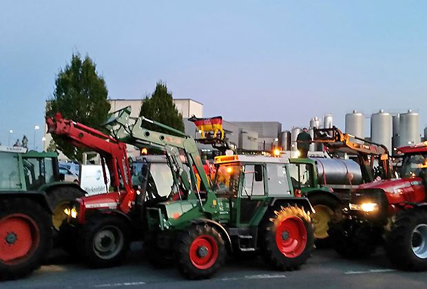 Im norddeutschen Edewecht haben am Montagabend 120 Milchbauern mit ihren Traktoren die Einfahrt zu einer Molkerei der DMK (Deutsches Milchkontor) blockiert. Sie protestieren gegen die tiefen Milchpreise, die das Unternehmen den Produzenten ausrichtet.