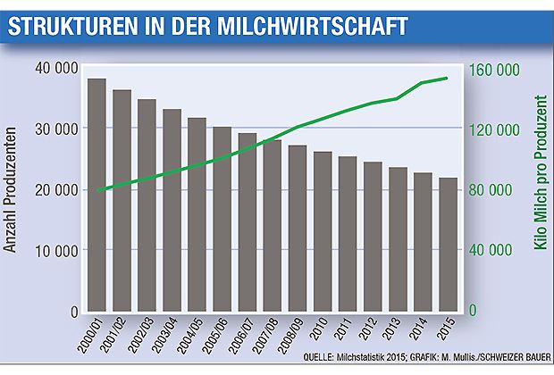 Der Strukturwandel in der Milchwirtschaft geht weiter. So sank die Zahl der ganzjährigen Milchproduzenten letztes Jahr um 773 auf 21875 Betriebe. Dies ist der Milchstatistik 2015 zu entnehmen.