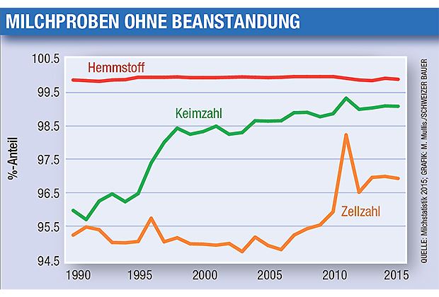 Weiterhin erfreulich entwickelt sich die Milchqualität. Die Zahl der Milchproben ohne Beanstandungen bei der Keimzahl und den somatischen Zellen ist seit den 1990er-Jahren stetig gestiegen. Rückstände von Hemmstoffen werden seit Jahren praktisch keine gefunden. Für Thomas Reinhard von den Schweizer Milchproduzenten hängt diese Entwicklung mit der besseren Melktechnik und der konsequenteren Milchkühlung zusammen. «Vor allem aber sind die Landwirte heute besser ausgebildet und werden auf das Thema Milchqualität sensibilisiert. Motivierend wirkte der 2011 eingeführte Zuschlag für gute Milchqualität», so Reinhard.