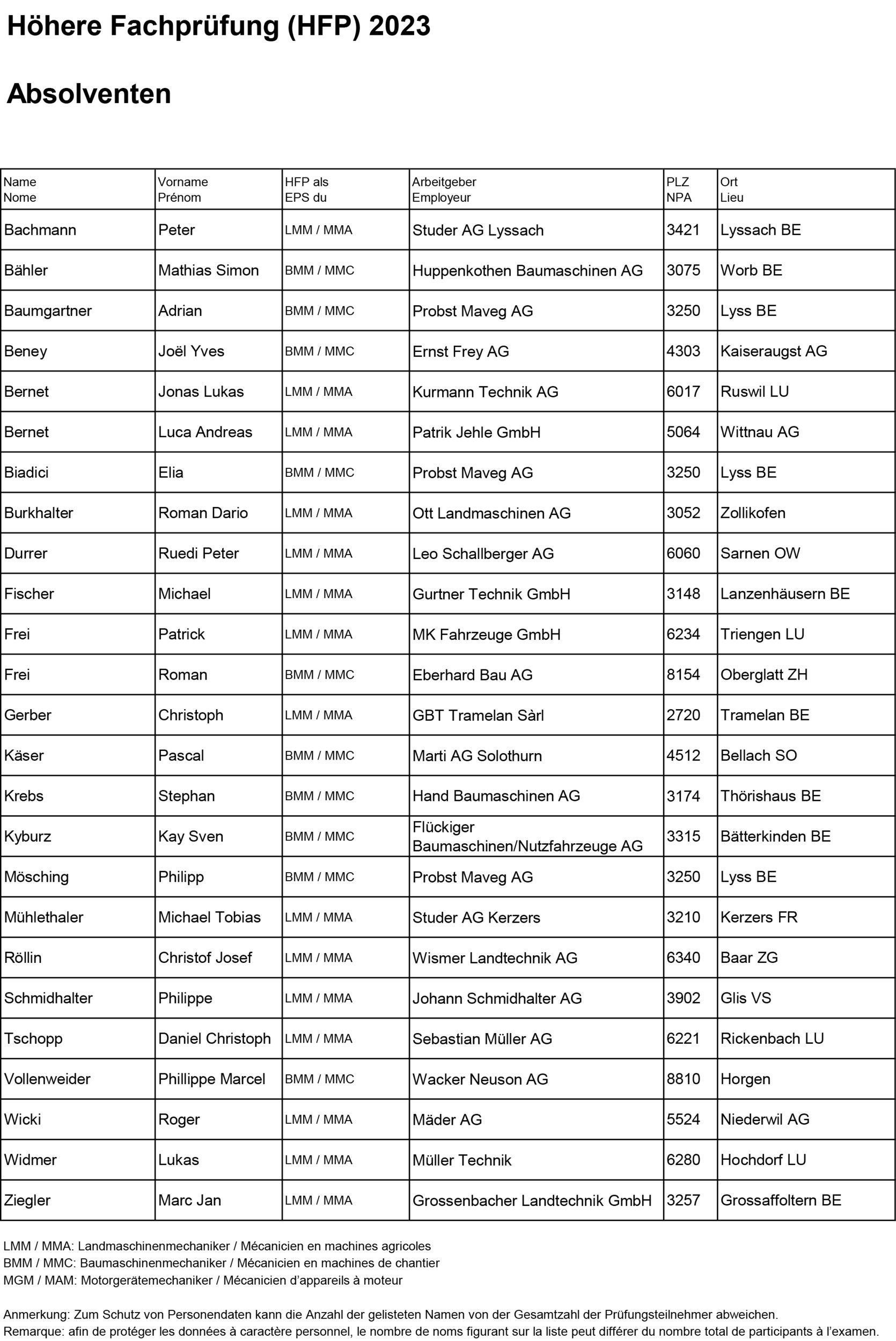 Der neu gewählte Meisterprüfungskommissionspräsident, Lukas Grüter aus Pfaffnau LU, dankte den Kandidaten für das faire Verhalten während der Prüfung und gratulierte den 15 Landmaschinenmechaniker-Meister und 10 Baumaschinenmechaniker-Meister zu ihrem Erfolg. Peter Bachmann aus Bremgarten bei Bern von der Studer AG in Lyssach BE, Philippe Schmidhalter aus Glis VS von der Johann Schmidhalter AG, aus Glis und Marc Jan Ziegler aus Unterramsern SO von der Grossenbacher Landtechnik GmbH wurde für die gute Note 5.0 besonders hervorgehoben.