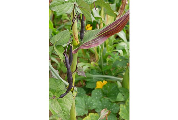 langen Stängel ranken sich violettfarbene Stangenbohnen, und auf dem Boden