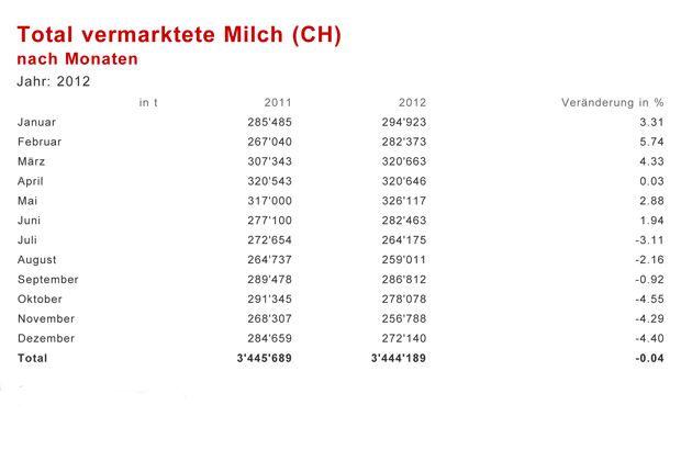 Nachdem die Milchproduktion im 2011 eine Höchststand erreicht hatte, sah es im 2012 zunächst nach einer weiteren Steigerung aus: Von Januar bis Juni 2012 lag die monatlich vermarktete Milchmenge konstant über derjenigen des Vorjahres. In der zweiten Jahreshälfte kam es zu einer Trendumkehr: Von Juli bis Dezember wurde weniger Milch eingeliefert. Gesamthaft wurden im letzten Jahr 3'444'189 Tonnen Milch vermarktet - 0,04 Prozent weniger als im 2011.