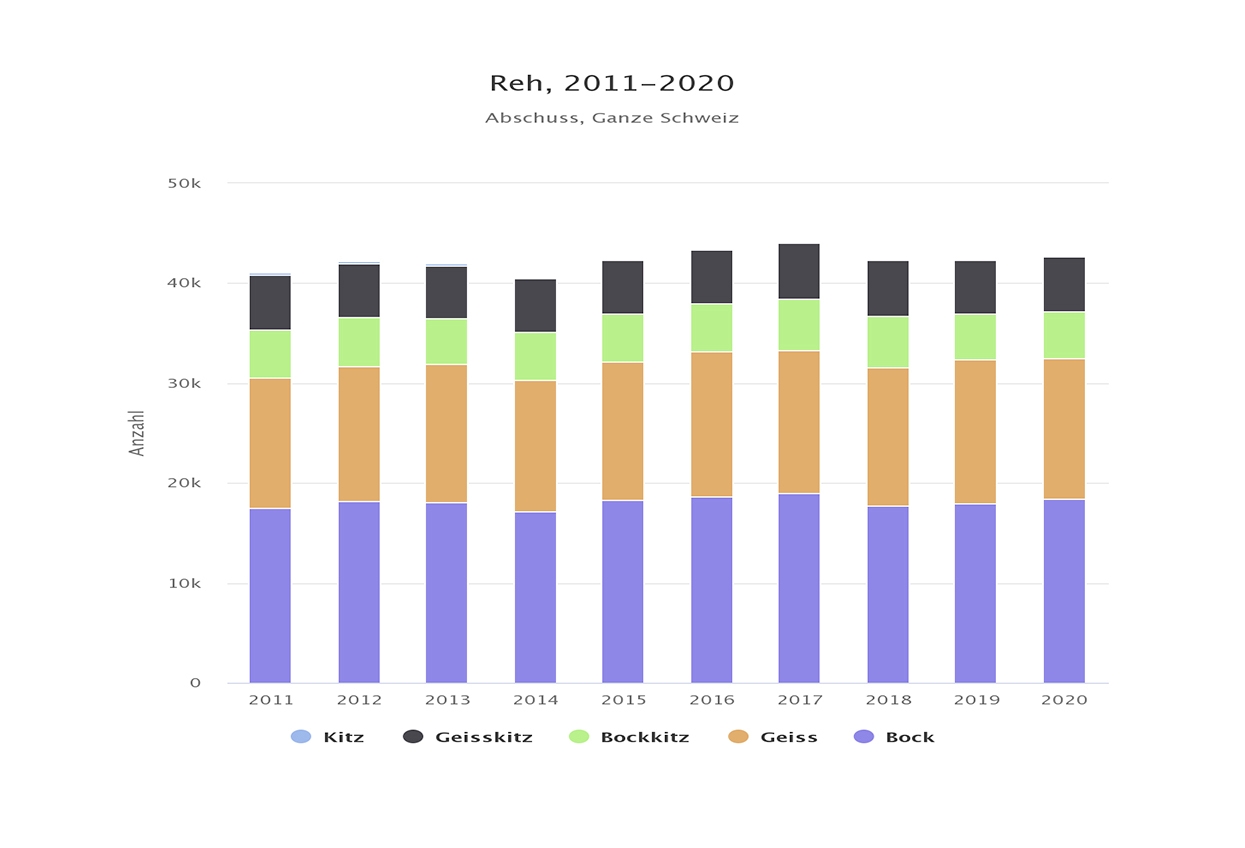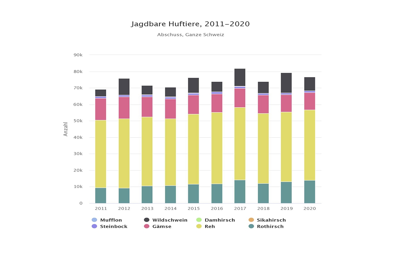 Im Jagdjahr 2020 sind in der Schweiz 76’695 Wildhuftiere erlegt worden. Im Jahr zuvor waren es noch über 79’000 Tiere. Wildschweine, Steinböcke und Rothirsche breiten sich laut der neusten Jagdstatistik in der Schweiz laufend aus. Die Bestände von Reh und Gämse sind hingegen stabil.