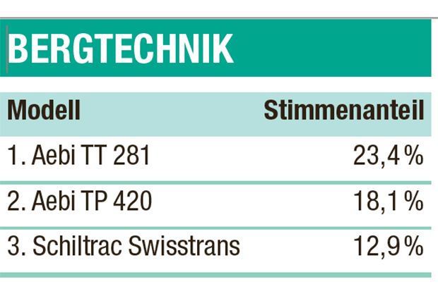 Die Tabelle der Kategorie Bergtechnik führt der Aebi TT281 an mit 23,4% der Stimmen. Der Zweiachsmäher ist durch seine hohe Leistung und sein geringes Leergewicht, gepaart mit den vier Lenkungsarten, ein echter Allrounder. Gleich danach folgt sein Geschwister aus dem selben Hause, der Transporter Aebi TP420 mit 18,1% der Stimmen. Auf dem 3. Rang platzierte sich der Schiltrac Swisstrans mit 12,9% der Stimmen.