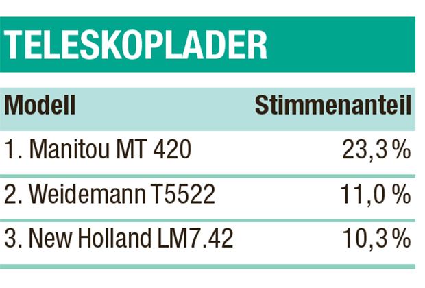 Die Kategorie Hoflader konnte der kompakte Lader Weidemann 1380 für sich entscheiden mit einem grossen Vorsprung auf seine Verfolger Kramer MT25.5e und Schäffer 2032. Die vierte Kategorie, die Teleskoplader, konnte der Manitou 420 für sich entscheiden. Der kompakte Lader hat mit 23,3% den ersten Platz für sich entschieden. Darauf folgen ihm der Weidemann T5522 mit 11% der Stimmen, gefolgt vom New Holland LM7.42 Elite auf dem dritten Rang mit 10,3% der Wettbewerbsstimmen.