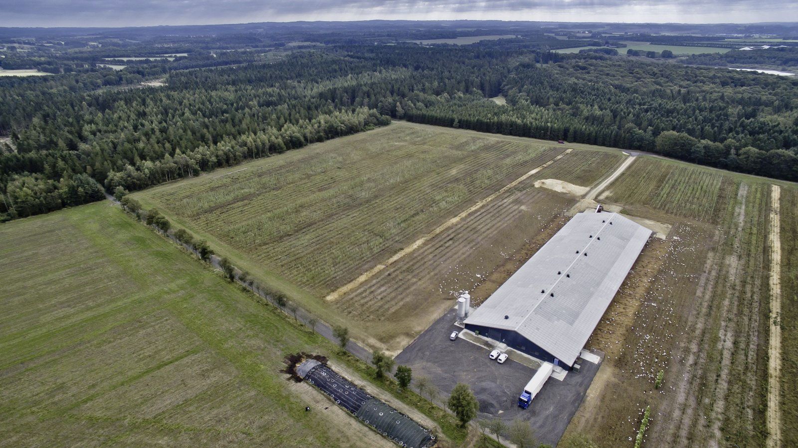 Auf den ersten Blick zeigt die Karte des ländlichen Gebiets ausserhalb der dänischen Stadt Brande hauptsächlich die 2000 Hektar biologische Gemüseproduktion. Bei näherem Hinsehen erkennt man 8 Geflügelställe, die in einem Umkreis von 10 Kilometern um den zentralen Hof und den Bürostandort verstreut sind.
