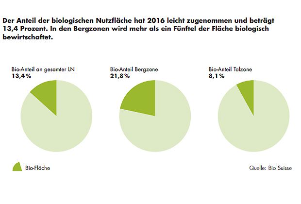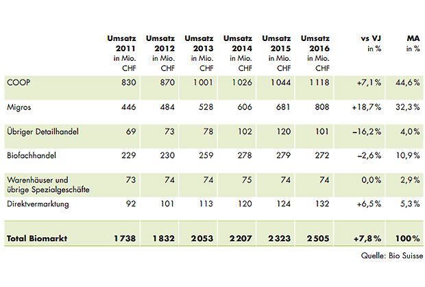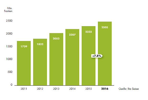 Der Umsatz mit Bioprodukten stieg um 7,8 Prozent auf 2,505 Milliarden Franken und erreichte mit 8,4 Prozent den bisher höchsten Marktanteil. In der Westschweiz sind Umsatz und Marktanteil überdurchschnittlich gewachsen. Wie in den Vorjahren machten die Frischprodukte rund die Hälfte des Umsatzes aus. Die meistgekauften Bioprodukte waren 2016 Eier, Gemüse und Frischbrote, die alle einen Marktanteil von über 20 Prozent aufweisen.