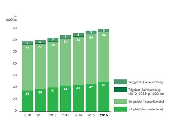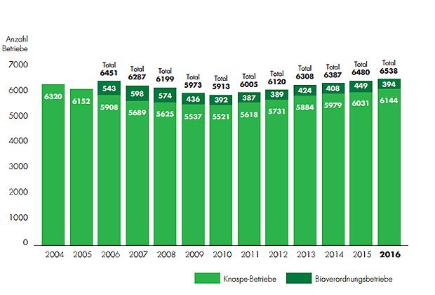 Im vergangenen Jahr haben sich mit 386 so viele Betriebe bei Bio Suisse neu angemeldet wie seit den 90er-Jahren nicht mehr. Insgesamt arbeiteten 6144 Produzenten nach den Richtlinien von Bio Suisse, wie die Organisation für ökologischen Landbau am Dienstag mitteilte. Kräfitg zugenommen hat auch die bewirtschaftete Fläche. Ende Jahr wurden rund 140'000 Hektaren nach Knospe-Richtlinen bewirtschaftet. Das sind 13.4 Prozent mehr als 2015. Einen Boom gab es auch beim Rebbau. Die Fläche nahm dank 26 neuen Winzern auf einem Schlag um einen Drittel zu.