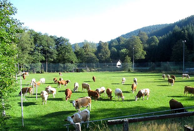 Normalerweise dient das satte Grün den Fussballerinnen und Fussballer des SV Baiersbronn im Schwarzwald als Spielunterlage. Nun haben aber am Montagvormittag 40 Kühe die Heimat von 13 Mannschaften für sich beansprucht.