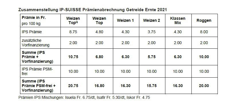 Für Getreide-Produzenten, die beispielsweise Pflanzenschutzmittel-freien IP-Suisse-Weizen der Klasse Top, erhalten insgesamt eine Prämie von 20.75 Fr./dt. Darin enthalten sind die 8.75 Fr. IP-Suisse-Prämie, 2 Fr. Vorfinanzierung und die 10 Fr. Prämie für die Pflanzenschutzmittel-freie Produktion. Landwirte, die Weizen 1 mit Einsatz von Pflanzenschutzmittel produzierten, erhalten eine Prämie von 6,30 Fr. je 100 Kilo.