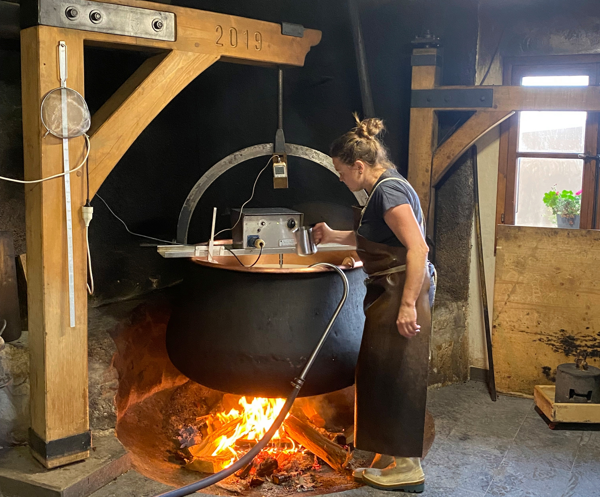 Sonja Moret stellt über dem offenen Feuer Vacherin Fribourgeois d’alpage AOP her.