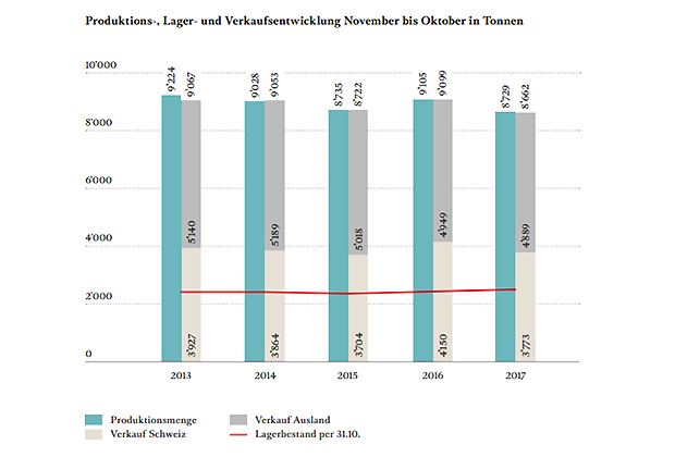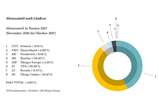 Im zweitwichtigsten Exportmarkt Frankreich wurden die Absatzzahlen von 2016 nicht erreicht werden und sanken auf 497 Tonnen. Die Exporte in den Beneluxländern konnten von 118 Tonnen auf 196 Tonnen gesteigert werden. Durch den Absatzrückgang im Inland stieg der Exportanteil um 1,6 Prozent und liegt bei 56 Prozent.