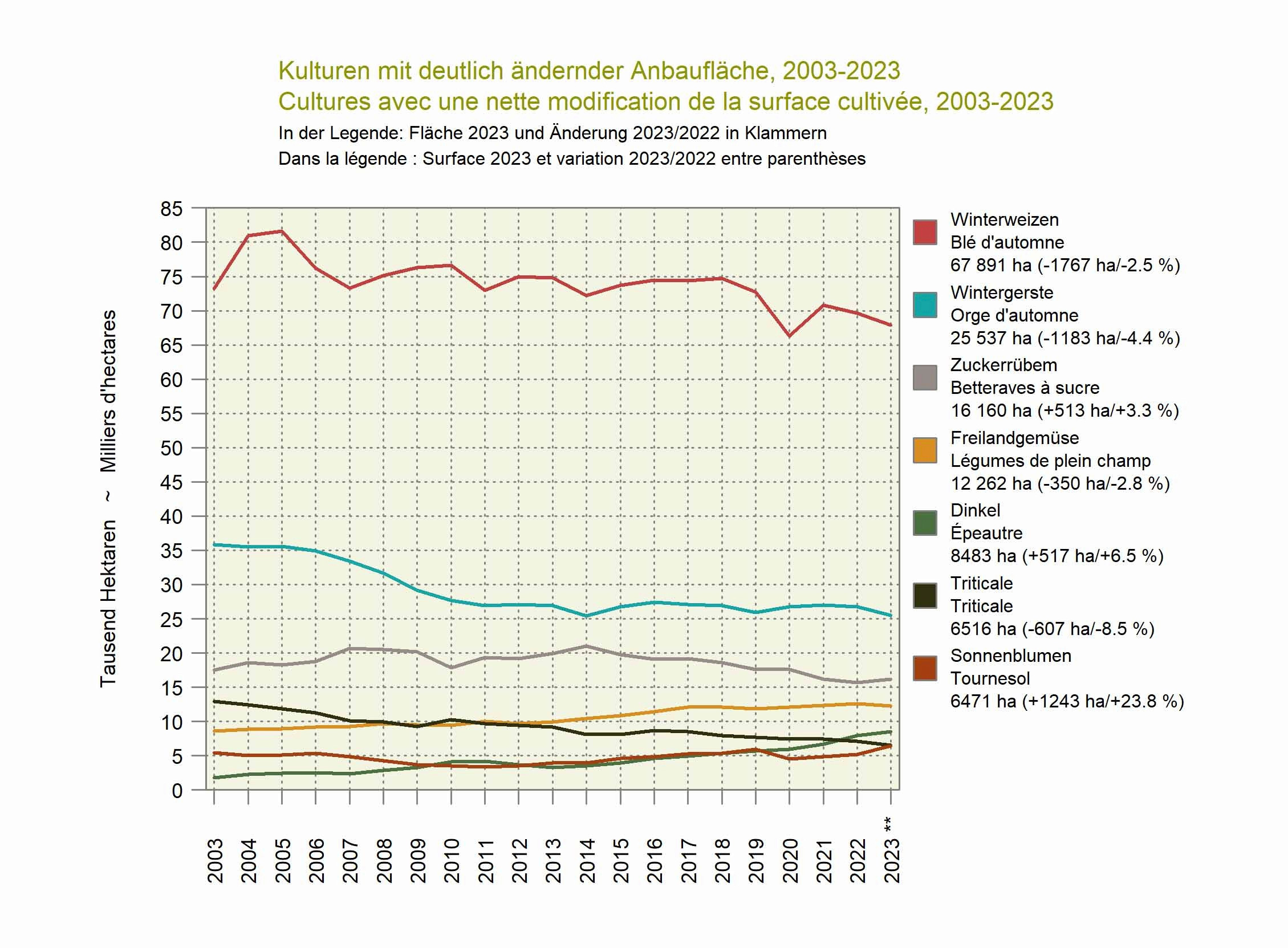 Die grössten Flächenänderungen (in absoluten Zahlen): Winterweizen (-1767 Hektaren), Sonnenblumen (+1243 Hektaren), Wintergerste (-1183 Hektaren), Triticale (-607 Hektaren), Dinkel (+517 Hektaren) und Freilandgemüse (-350 Hektaren).