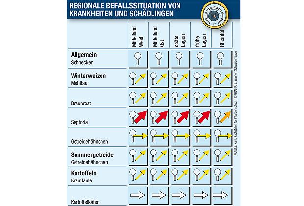 Winterweizen: Der Winterweizen befindet sich im Stadium 51 (Beginn Ährenschieben) bis 61 (Beginn Blüte). Der Befall mit Mehltau verharrt auf tiefem Niveau. Auf anfälligen Sorten wie Arina, Runal, Forel oder Suretta kann der Pilzdruck grösser sein. Vereinzelt treten Braunrost-Pusteln auf. Mit den warmen Temperaturen in den nächsten Tagen werden sich beide Pilzkrankheiten wohl ausbreiten.