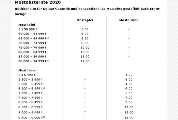 Damit der Markt weiterhin entlastet werden kann und die Lagerbestände in diesem Jahr weiter abgebaut werden können, beschloss das Produktzentrum (PZ) Mostobst einen mengenabhängigen Rückbehalt. Angewendet wird das letztjährige Modell. Der Rückbehalt bei den Mostäpfeln startet bei 5.- Fr./ 100kg und steigt pro 5000 Tonnen kontinuierlich an. Bei den Mostbirnen startet der Rückbehalt mit 4.- Fr./100kg und steigt pro 500 Tonnen.