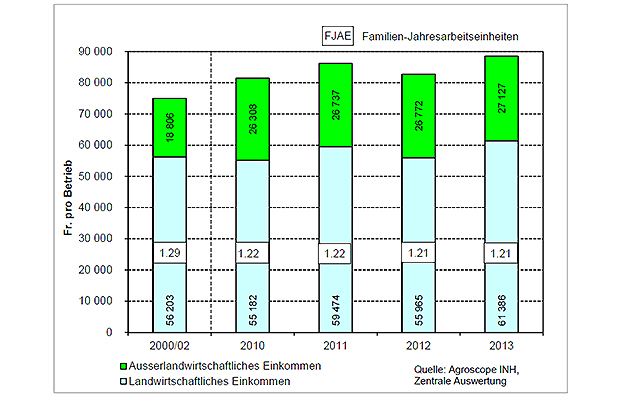 2013 erwirtschafteten die Betriebe im Schnitt ein landwirtschaftliches Einkommen von gut 61'000 Franken (+9,7% gegenüber 2012). Auch das ausserlandwirtschaftliche Einkommen ist um 1 Prozent auf rund 27‘100 Franken gestiegen. In der Summe erreichten die Betriebe gemäss Agrarbericht ein Gesamteinkommen von rund 88‘500 Franken (+7%). Im elfjährigen Vergleich 2000/02–2011/13 haben die Betriebe ihr landwirtschaftliches Einkommen um rund 5 Prozent und ihr ausserlandwirtschaftliches Einkommen um 43 Prozent verbessert. Die Betriebe steigerten in diesen elf Jahren ihr Gesamteinkommen um 14 Prozent. (Grafik 1)
