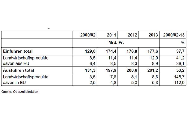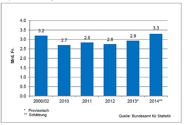 Bei den Kosten waren 2013 insbesondere die Ausgaben für Vorleistungen um 58 Millionen Franken tiefer als 2012. Im Vergleich zum Dreijahresmittel 2000/02 war das Einkommen des Landwirtschaftssektors in den Jahren 2011/13 aber rund 360 Millionen Franken tiefer. Laut Schätzungen des Bundes dürfte jedoch das Sektoreinkommen im laufenden Jahr wieder um rund 360 Millionen Franken höher ausfallen als 2013 und somit beinahe die Grenze von 3,3 Milliarden Franken erreichen.
