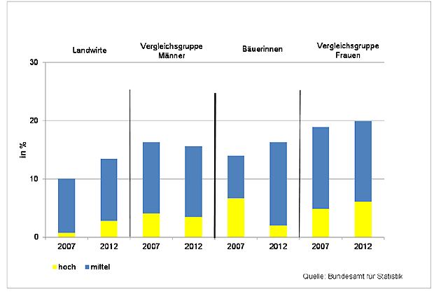 Die Gesundheitsbefragung 2012 des Bundesamts für Statistik BFS zeigt, dass bei den Landwirten und Bäuerinnen die psychische Belastung („hohe“ sowie „mittlere“) insgesamt zugenommen hat (Grafik 3). Im Vergleich zur übrigen Bevölkerung ist aber die psychische Belastung von Landwirten und Bäuerinnen tiefer. Unter der höchsten psychischen Belastung litten die befragten Frauen der Vergleichsgruppe, den niedrigsten Anteil an „hoher“ psychischer Belastung wiesen 2012 die Bäuerinnen aus.