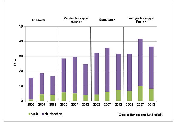 2012 waren die Landwirte insgesamt am wenigsten von Schlafstörungen betroffen (vgl. Grafik 4). Frauen hingegen leiden häufiger unter Schlafstörungen: So traten bei rund einem Drittel der befragten Bäuerinnen und übrigen Frauen stärkere oder leichtere Ein- und Durchschlafstörungen auf, am häufigsten bei der Vergleichsgruppe Frauen. Bei den Landwirten und Bäuerinnen sind im Zeitraum 2002 bis 2012 die „starken“ Schlafstörungen etwas gestiegen, ebenso bei den übrigen Frauen. Bei der Vergleichsgruppe Männer haben diese hingegen abgenommen, heisst es im Bericht.