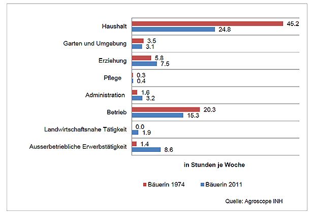 Der wöchentliche Zeitaufwand der Bäuerinnen reduzierte sich zwischen 1974 und 2011 von gut 78 auf knapp 65 Stunden. Geringer fiel der Aufwand insbesondere für den Haushalt (von 45 auf 25 Stunden pro Woche, Grafik 5). Der Zeitaufwand für den landwirtschaftlichen Betrieb sank um 25 Prozent auf 15 Stunden pro Woche. Bäuerinnen wendeten 2011 im Durchschnitt 2 Stunden pro Woche für landwirtschaftsnahe Tätigkeiten auf, 1974 wurden diese nicht separat ausgewiesen. Der Zeitaufwand für die Administration (+1,6 h/Woche) und die Kindererziehung (+1,7 h/W) nahm seit 1974 etwas zu. Deutlich zugenommen von 1,5 auf 8,5 Stunden pro Woche hat der Zeitaufwand der Bäuerinnen für ihre ausserbetriebliche Erwerbstätigkeit, wird im Bericht festgehalten.