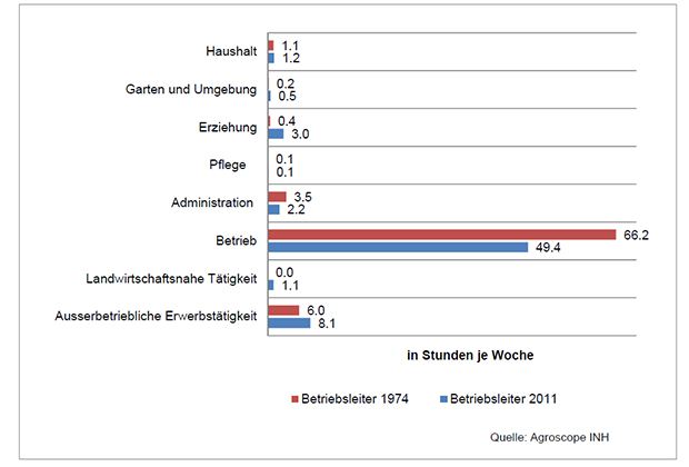 Bei den Betriebsleitern sank der durchschnittliche wöchentliche Zeitaufwand (von 78 auf 66 Stunden) ebenfalls stark. Reduziert hat sich insbesondere der zeitliche Aufwand für die landwirtschaftlichen Arbeiten (von 66 auf 55 Stunden, Grafik 6). Auch der Zeitaufwand für die Administration ging von 3,5 auf gut 2 Stunden pro Woche zurück. Zugenommen um 2 Stunden auf 8 Stunden pro Woche hat hingegen der Aufwand für die ausserbetriebliche Erwerbstätigkeit. Für die Erziehung wendeten die Betriebsleiter 2011 pro Woche 3 Stunden auf (1974: 0,5 Std.).