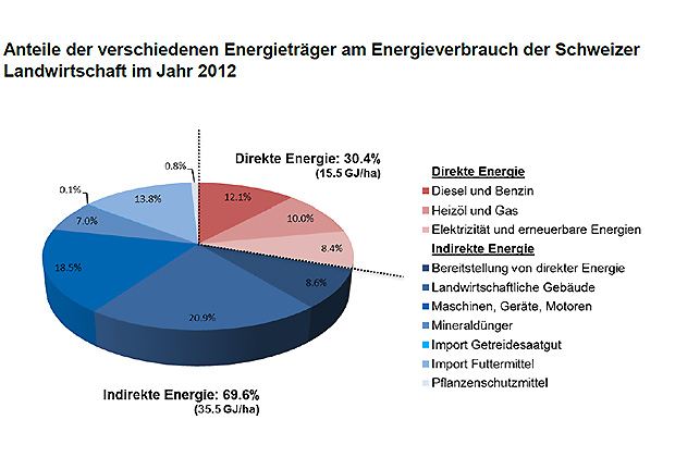Der Gesamtverbrauch ist konstant: Pro Hektare und Jahr verbraucht die landwirtschaftliche Produktion rund fünfzig Gigajoule, wie die Forschungsanstalt Agroscope am Dienstag mitteilte. Jährlich werden pro Hektare landwirtschaftliche Nutzfläche 1400 Liter Heizöläquivalent für die Produktion landwirtschaftlicher Primärgüter verwendet.