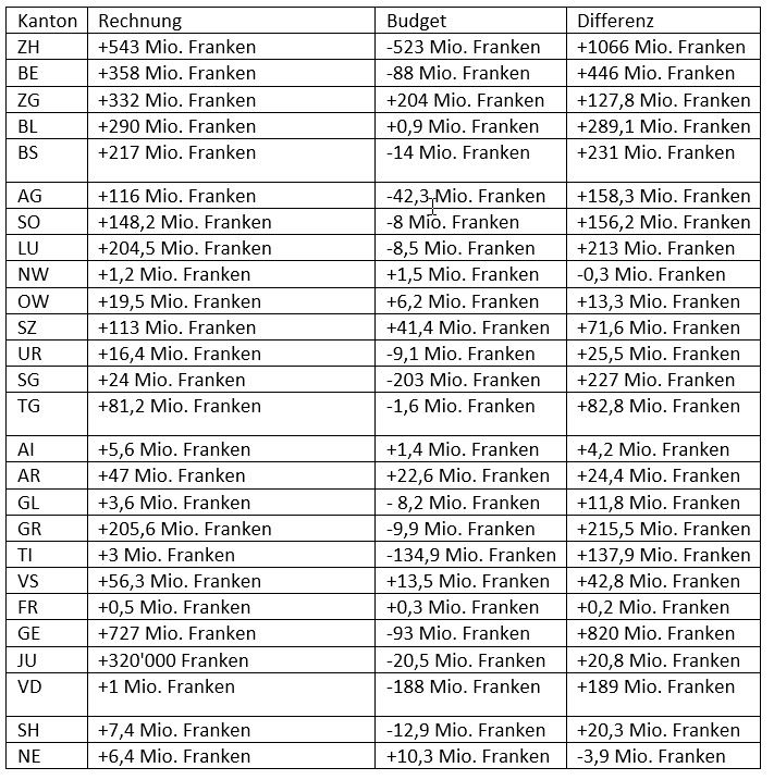 Das zweitbeste Ergebnis seit dem Vorliegen der entsprechenden Daten (1999) gab es 2007, als lediglich das Tessin und Appenzell-Ausserrhoden rote Zahlen schrieben. 2021 hatten fünf Kantone negative Ergebnisse verzeichnet.