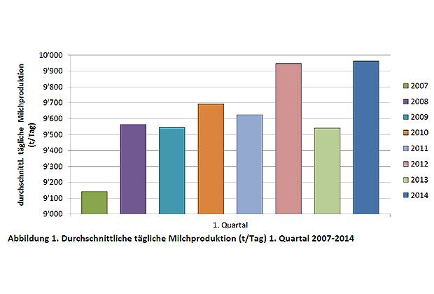 Die Milchproduktion hat seit Juli 2013 wieder stark zugenommen. Im 1. Quartal 2014 stieg die Milchproduktion im Vergleich zur Vorjahresperiode um 4,4 Prozent. Dies führte auch zu einer höheren Käseproduktion. Ein neuer Rekord wurde ebenfalls bei der täglichen Milchproduktion realisiert.