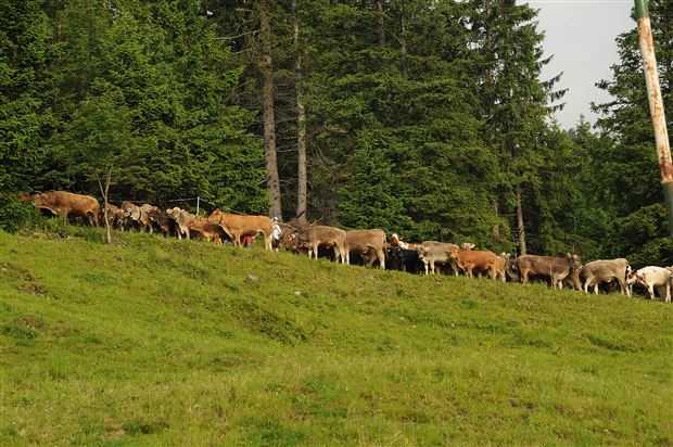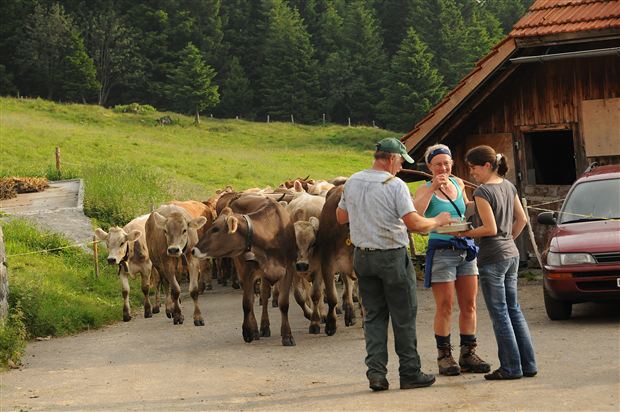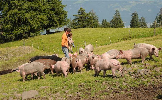 Neben den 95 Kühen – davon 18 aus dem heimischen Hof der Abderhaldens – werden 160 Rinder und rund 20 Alpschweine auf Malbun betreut. Die Alpschweine sind hier neben dem eigenen Grauvieh Margrits Lieblinge. Das muss wohl gegenseitig sein; kaum erscheint Margrit auf der Bildfläche – meist in Begleitung ihrer Kinder Simon und Melina –, kommen die zutraulichen Alpschweine den Hang hinauf angerannt. Auf der Weide können sie sich nach Herzenslust frei bewegen. Ein schöner Anblick.