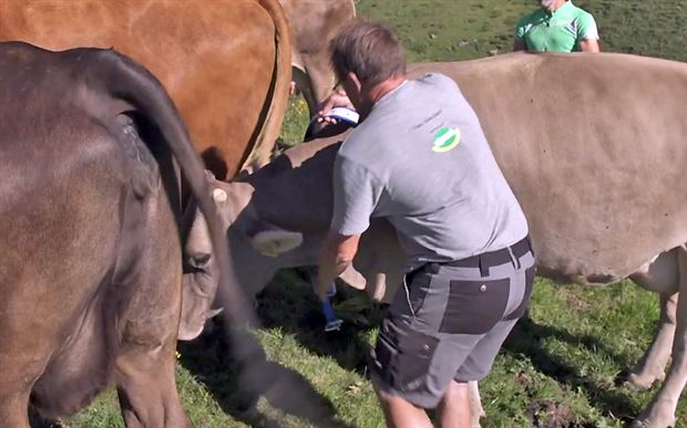 Im Gebiet der Arena Alva in der Region Flims wollen sie versuchen, den Wanderern mehr Sicherheit zu geben. In einem Pilotprojekt werden Mutterkühe mit einem Alptracker ausgerüstet. Alpmeister Gion Beeli aus Sagogn GR macht beim Projekt mit. Beeli hat einige seiner Kühe mit einen speziellen Halsband ausgerüstet. An diesem ist der Tracker angebracht.