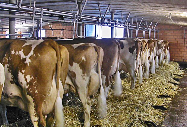 U-förmige Bügel an einem massiveren verzinkten Eisenrohr hängen im Stall von Familie Ueli Berger aus Aeschi bei Spiez BE über dem Widerrist der Kühe. Jeder Bügel ist auf die darunterstehende Kuh mit einem Mindestabstand von fünf Zentimetern angepasst. Dies ist eine der Auflagen des Bundesamts für Veterinärwesen (BVet), die der Bio-Kuhtrainer Indermühle, wie er mit vollständigem Namen heisst, erfüllen muss. Als Alternative zum elektrischen Kuhtrainer, welcher ab kommendem Monat nicht mehr neu montiert werden darf, ist klar kein Strom in den Bügeln.