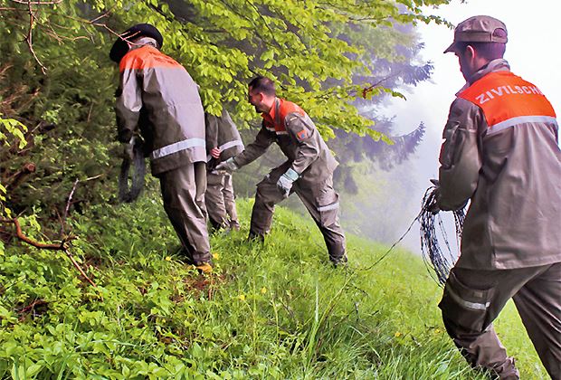 Vor drei Jahren übernahm er zusammen mit seiner Frau den Betrieb und meldete sich letztes Jahr auf den Aufruf des SGBV. Nun stehen fünf Zivilschutzleistende bei ihm im Einsatz, dies im Rahmen der «Einsätze zugunsten der Gemeinschaft». Meter um Meter wird der Draht freigelegt und aufgerollt. Rollenweise wird er an einem Stecken gesammelt.