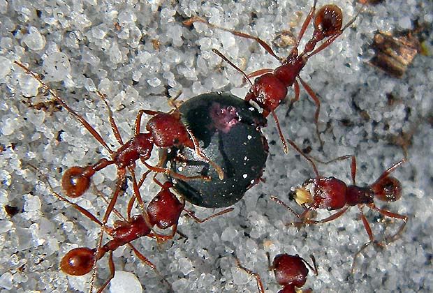 Ameisen optimieren bei der Nahrungssuche ihre Laufwege. Vereinzelte Tiere einer Kolonie suchen Futter zunächst chaotisch nach dem Zufallsprinzip und bringen es ins Nest zurück. Dabei hinterlassen sie eine Spur aus flüchtigen Duftstoffen (Pheromonen), die nach und nach umso stärker wird, je kürzer der Weg ist.