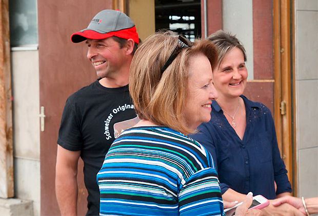 Derweil versuchen Tobias und Maria Kälin, ihren Zeitplan einzuhalten. Begrüssung, Informationen zum Hof, Degustation der Heumilch, Rundgang durch den Betrieb und Verabschiedung. Eine Stunde ist schnell vorbei. Bevor die Amerikaner gekommen sind, hat Maria im Gaden unten einen Blumenstrauss hingestellt, Milchkrug und Becher gerichtet und den Boden gewischt.