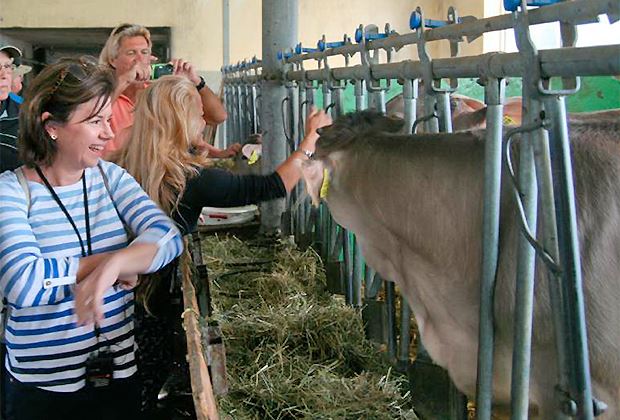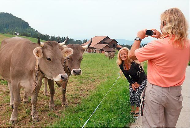Schweizer Stier trifft amerikanische Reisegruppe – für ihn sind das «old news» – unzählige Touristen sind schon im Stall an ihm vorbeigelaufen und haben ihn bewundert. Ganz anders die Kälber im Abteil nebenan: Sie lecken eifrig die Hände, die in ihre Nähe gelangen, was allgemeines Entzücken auslöst. «They are so cute!»