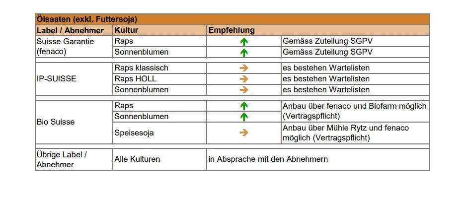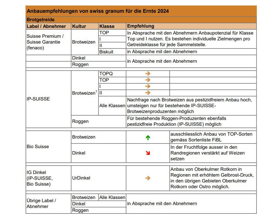 Swiss Granum erarbeitet zusammen mit Verarbeitern, Handel und Landwirtschaft Anbauempfehlungen zur Steuerung des Angebots in der Schweiz. Wie Swiss Granun schreibt, handelt es sich um nationale Mittelwerte, regionale Abweichungen sind möglich.
