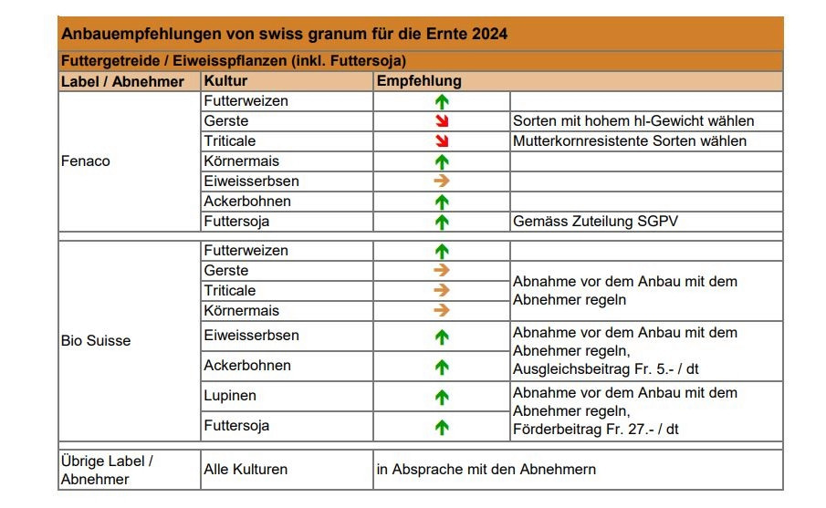 Um die Auslandabhängigkeit im Bereich Futtermittelrohstoffe reduzieren zu können, empfiehlt die Branchenorganisation, die Anbaufläche von Futterweizen, Körnermais und Ackerbohnen auszudehnen, und jene von Gerste und Triticale zu reduzieren. Beim Anbau sei den qualitativen Bedürfnissen der Abnehmer (Hektolitergewicht bei Gerste, Mutterkorn bei Triticale) Rechnung zu tragen. Entsprechende Sorten sind auf der Liste empfohlener Sorten von Swiss Granum zu finden. Bei der Futtersoja bestehen Verträge mit Verarbeitern, die Nachfrage ist weiterhin hoch.