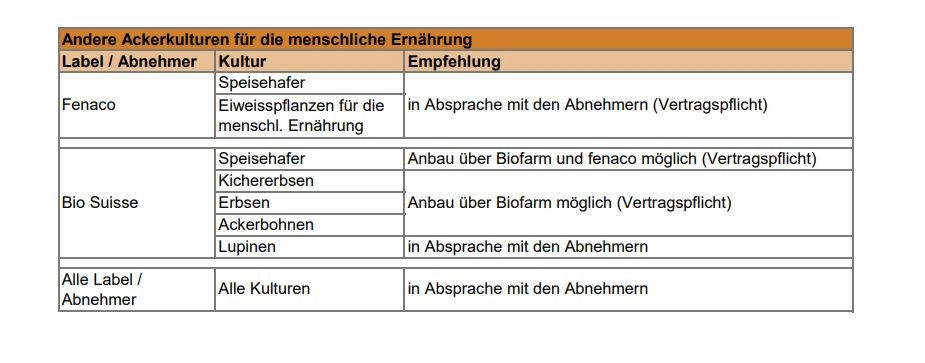 Für die Bioackerkulturen sind die Empfehlungen von Bio Suisse respektive die Vereinbarungen mit den Abnehmern zu beachten, schreibt Swiss Granum. Im Bio-Bereich sind Futterweizen und sämtliche Körnerleguminosen sowie insbesondere Futtersoja gesucht.