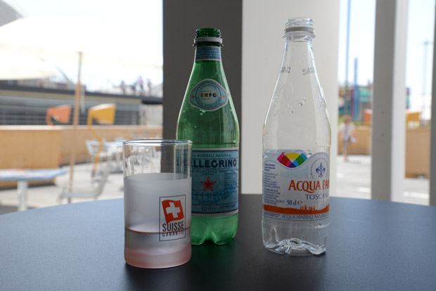 Expo Milano - Suisse Garantie-Glas und italienisches Mineralwasser - offenbar eine Vorschrift der Veranstalter