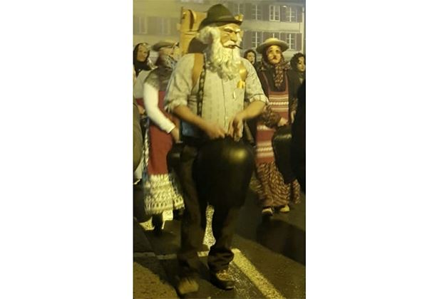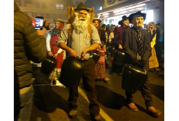 Simon von Weissenfluh aus Meiringen BE hat uns zwei schöne Bilder vom Ubersitz im Haslital zugesandt. Darauf ist ein alter (verkleideter) Mann beim Trycheln zu sehen. Die Trychelzüge aus den Dörfern Willigen, Hausen, Eisenbolgen, Unterbach, Hasliberg und Meiringen vertreiben in der Altjahrswoche die bösen Geister aus dem Haslital.