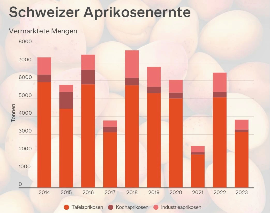 Insgesamt wurden 2023 auf 720 Hektar rund 50 verschiedene Sorten Aprikosen angebaut – 680 Hektaren allein entfallen dabei auf den Kanton Wallis.