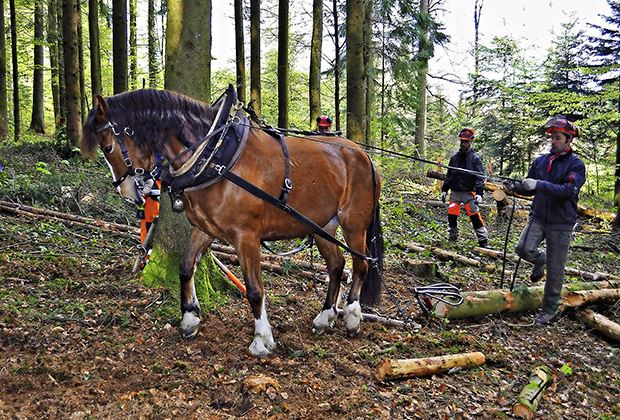 Der Pferdeeinsatz hat einige Vorteile. Dies zeigt das Beispiel Holzrücken, wo Schwachholz bis max. 40 cm Durchmesser bis zu den Rückegassen gezogen wird. Als Ergänzung zur Maschine macht hier der Pferdeeinsatz Sinn, verursacht doch das Pferd kaum Bodenschäden, und die stehenden Bäume werden geschont.