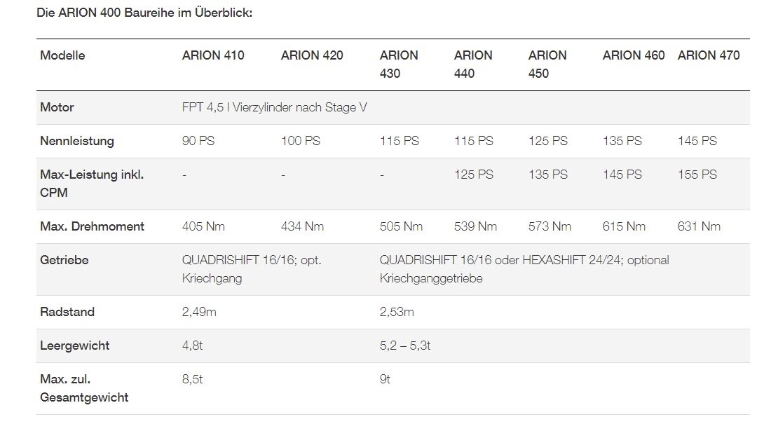 Claas stattet die Arion-400-Traktoren anlässlich der Einführung der Abgasstufe Stage V mit einer Reihe neuer leistungssteigernder Parameter aus. Die sieben Modelle decken einen Bereich von 90 bis 155 PS Maximalleistung mit CPM nach ECE R120 ab. Das neue Flaggschiff der Baureihe, der Arion 470. Dieser bringt es auf bis zu 155 PS Maximalleistung und 631 Nm maximales Drehmoment mit CPM.