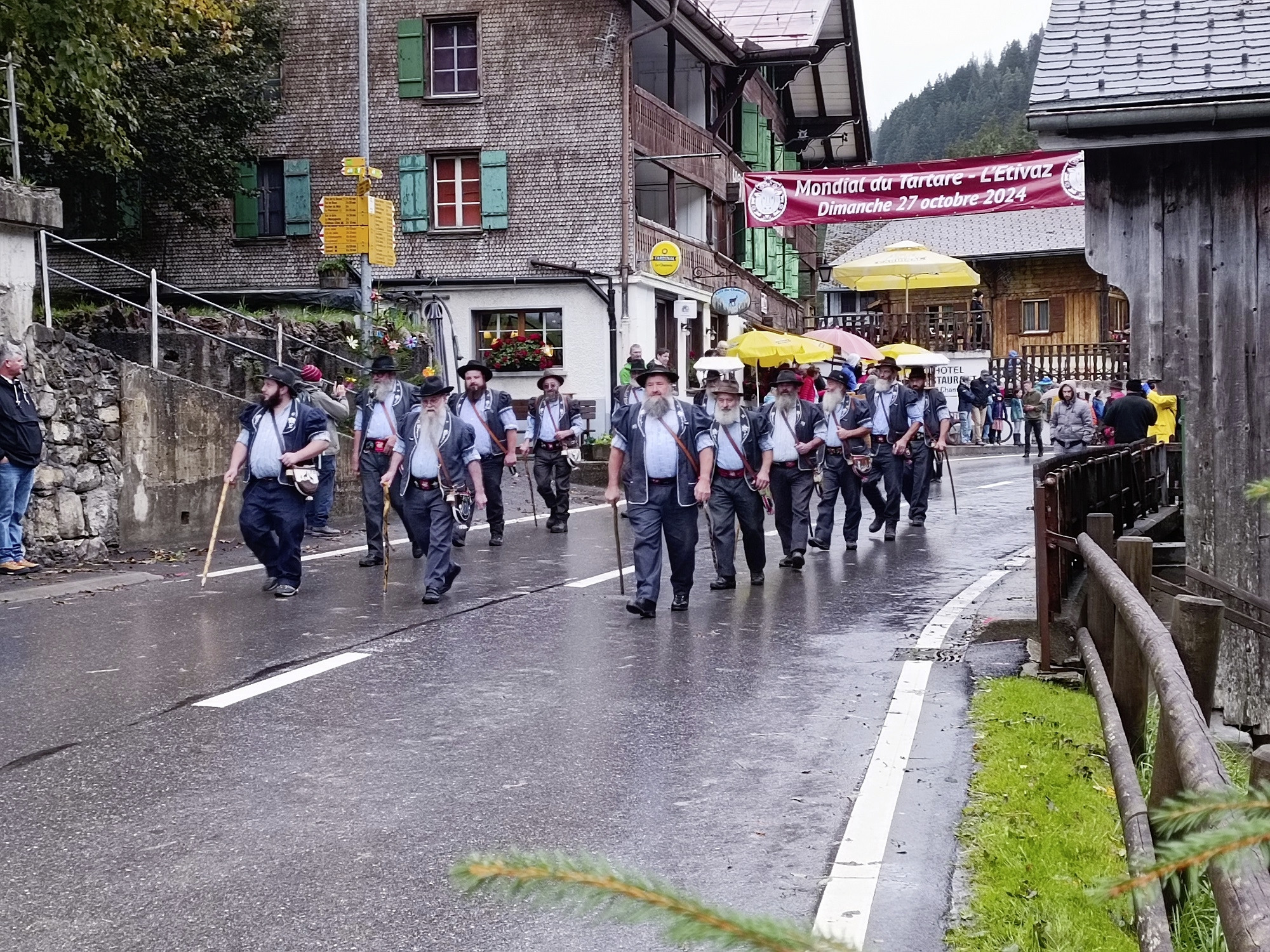 Sieben Familien trotzten am 28. September 2024 dem kühlen Regenwetter und zogen von ihren Alpen hinunter ins Dorf L’Etivaz und weiter ins Tal. Vorbei am riesigen Käsekeller der Genossenschaft von L’Etivaz.