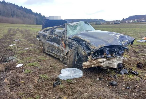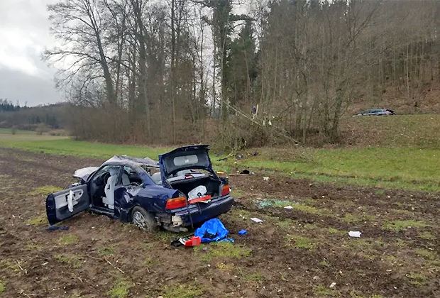 Der Wagen durchbrach ein kleines Waldstück. Anschliessend überschlug sich das Fahrzeug mehrfach. Völlig demoliert kam das Auto im angrenzenden Acker zum Stillstand. Der Lenker verletzte sich und wurde mit der Ambulanz ins Spital überführt. An Fahrzeug entstand Totalschaden.