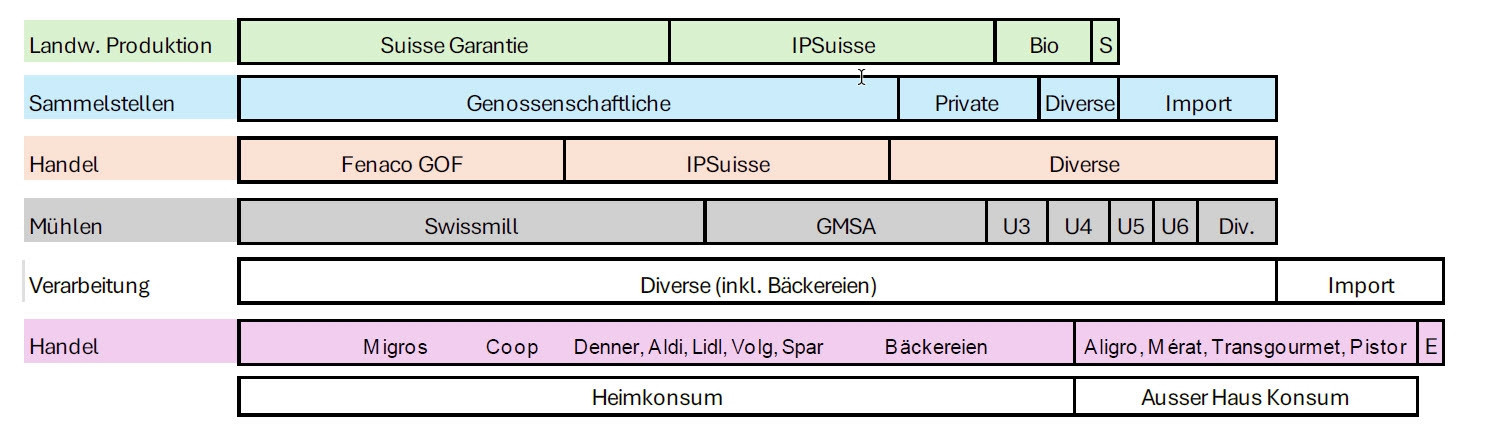 Drei Viertel der Mengen laufen über genossenschaftliche Sammelstellen, viele davon bei der Landi. Der Getreidehandel ist stark konzentriert. Fenaco und IP-Suisse handeln mehr als zwei Drittel der Inlandmenge. Auch die Mühlenwirtschaft sei eng gebündelt. Sieben Unternehmen vermahlen über 90 Prozent des Schweizer Getreides, die beiden grössten dominieren.