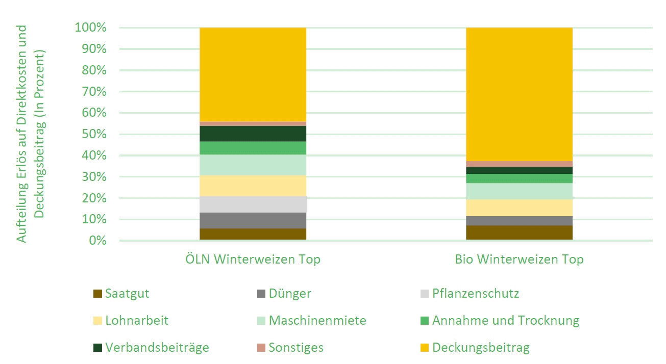 Aufteilung des Erlöses (ohne Direktzahlungen) aus der Brotweizenproduktion in Direktkosten und Deckungsbeitrag für das Jahr 2023.
